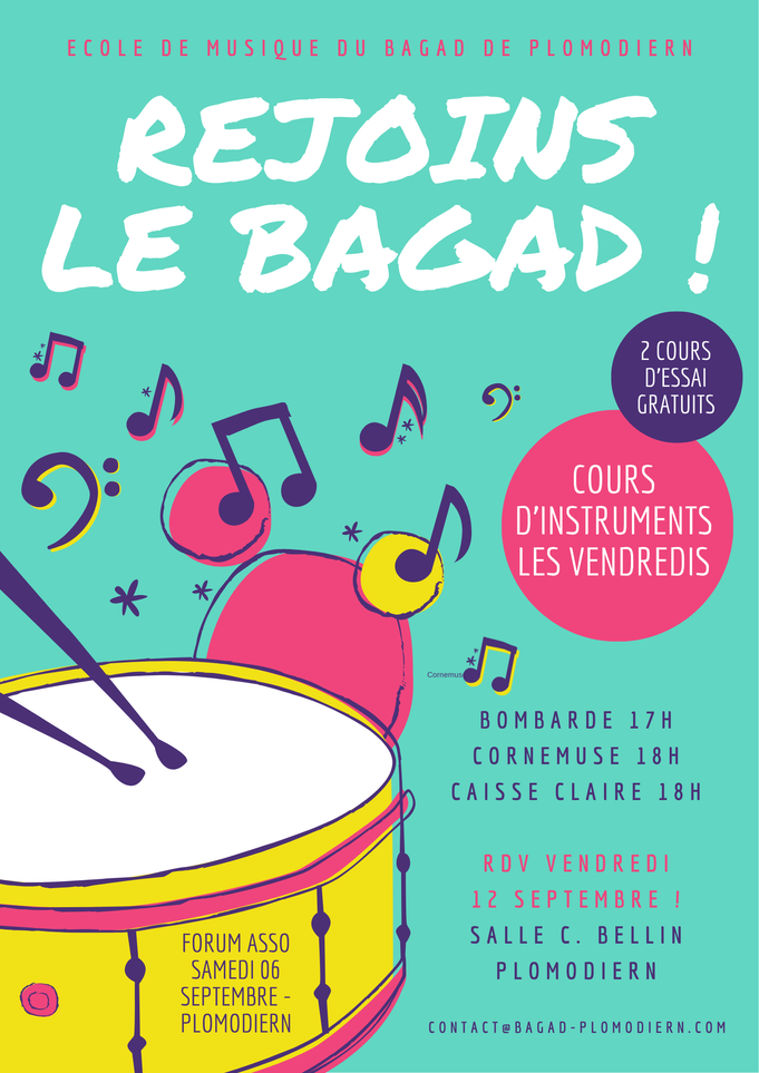 L'école de musique du bagad prépare la rentrée du mois de septembre. A destination des jeunes qui s'intéressent à la musique et voudraient apprendre à jouer d'un instrument, nous organisons une séance d'essai le vendredi 28 juin 2024 de 18h à 19h à la salle communale de Plomodiern. N'hésitez pas !